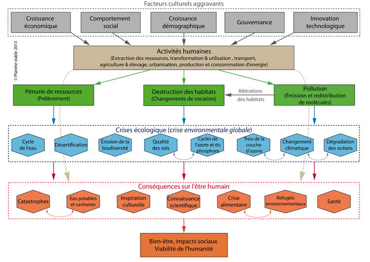 Ces trois conséquences directes des activités humaines sont à l’origine des diverses crises environnementales qui ont des effets locaux autant que globaux. Par suite, ces crises sont regroupées sous le terme de crise environnementale globale. Ces liens entre les activités humaines et leurs facteurs aggravants, leur impact direct (ou conséquences) et la crise globale sont schématisés sur la figure ci-dessous :