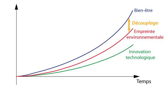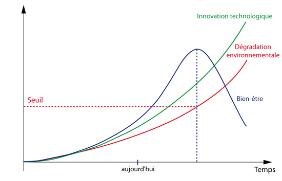 Autrement dit, les progrès considérables de la technologie semblent avoir permis de découpler au moins en partie, et pour un temps, le bien-être de la dégradation environnementale. Cette explication du paradoxe de l’environnementaliste est schématisée sur le graphique ci-dessous :