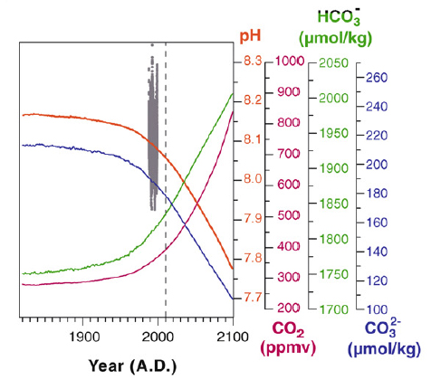 Ce qui est trompeur avec le pH c’est que de petites variations cachent en fait de grandes variation de concentration des espèces chimiques. C’est ainsi que la variation de pH de 0,1 unité correspond à une augmentation des ions H+ de 26% (comme l’indiquait le dernier rapport du GIEC), ce qui est considérable. Ce qui est inquiétant c’est que ces modifications ont déjà des effets sur le comportement des animaux marins et leur faculté de survivre et de se reproduire, et qu’elles menacent les coraux (avec la température qui augmente aussi). De plus, malheureusement, l’impact humain s’accélère, ce qui laisse entrevoir des répercussions de plus en plus importantes.