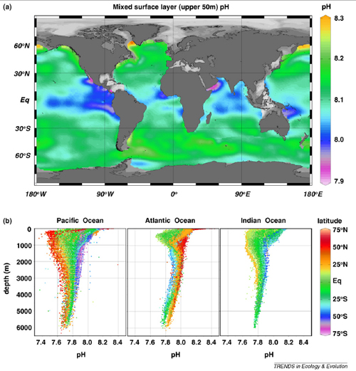 Ce processus influence aussi le pH des profondeurs. Comme le montre la figure du bas, le pH à tendance à diminuer lorsqu’on descend vers le fond océanique. On peut observer également une réduction progressive de l’étendue de la variation du pH pour des couches d’eau situées plus en profondeur. Cette caractéristique laisse supposer que les contraintes que peut supporter la faune et la flore benthique et que leur tolérance aux variations de leur environnement sont plus faibles que celles les espèces vivant plus en surface. Cet aspect est certainement à prendre en considération quand on considère les changements climatiques et la détérioration de l’environnement.