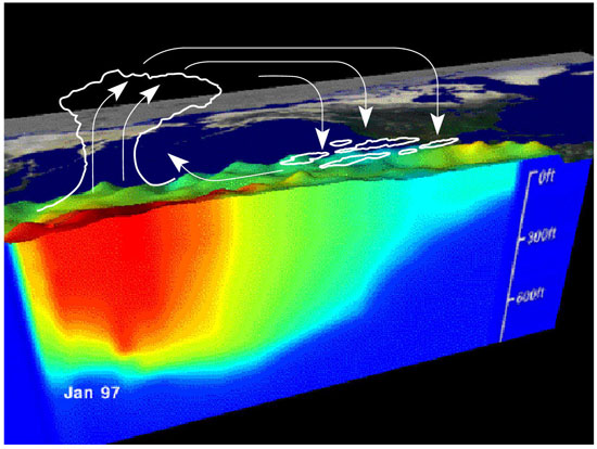 En temps normal, les côtes de l’Amérique du Sud sont le siège d’importantes remontées d’eau, des courants ascendants venant des fonds marins, qui sont riches en nutriments. Ceux-ci nourrissent un plancton alors abondant, qui lui-même sert de nourriture aux poissons qui prolifèrent, la manne pour les pêcheurs péruviens.