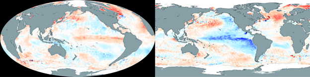 Comparaison de la température de la surface de l’eau dans l’Océan Pacifique lors des phénomènes El Niño et La Niña (novembre 2007). L’eau coloriée en rouge est chaude et celle en bleue est froide (Source : NASA).
