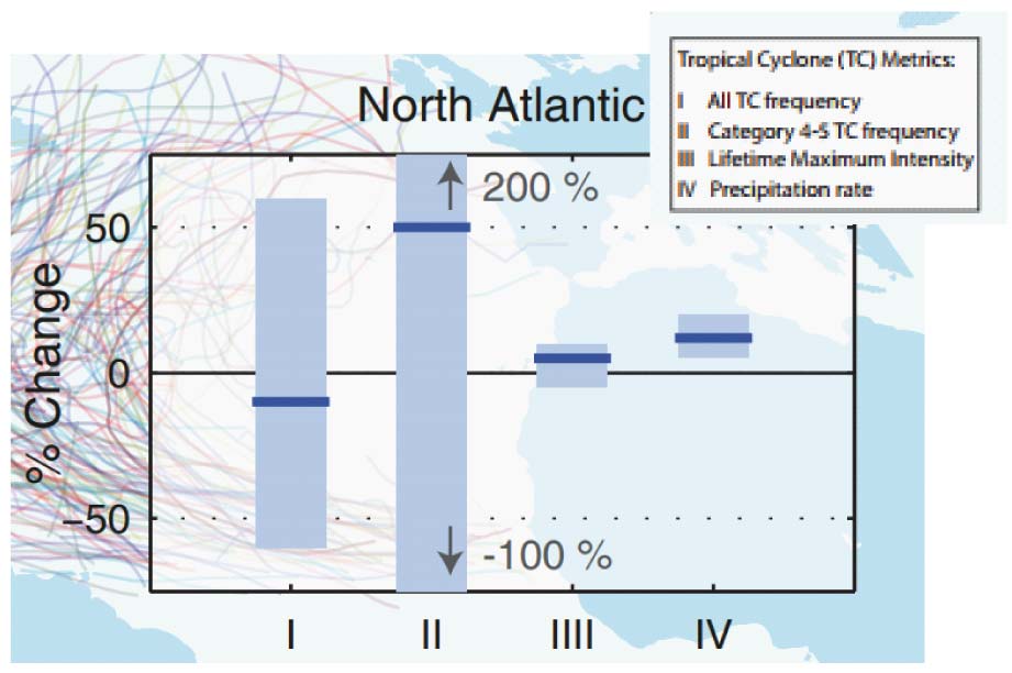 Le graphique suivant indique que les tempêtes tropicales simulées pour la fin du 21e siècle et atteignant nos latitudes dans l’Atlantique Nord, seront moins nombreuses, mais plus intenses, dureront plus longtemps et généreront des précipitations plus fortes par rapport au présent. En lien avec ces changements, les vents moyens montreront une légère augmentation [6] de même que l’instabilité atmosphérique aux latitudes moyennes [7-10]. De même, les variabilités interannuelle et inter décennale du vent augmenteront faiblement dans le futur [11].