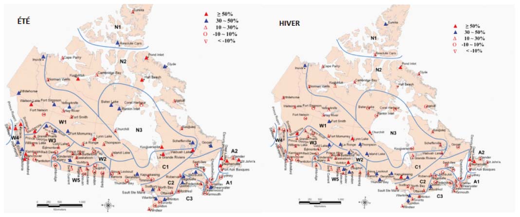 Des scientifiques [17] ont modélisé plus spécifiquement les modifications de la fréquence des rafales supérieures à 70 km/h au Canada vers la fin du siècle par rapport au passé récent. En considérant un scénario d’émission de GES plutôt fort, l’étude montre une hausse de la fréquence des vents violents (figures ci-dessous). Cette conclusion concorde avec l’augmentation projetée de l’intensité des tempêtes. L’été, avec ses orages localisés, semble plus propice aux rafales que l’hiver qui présente des systèmes météo plus grands mais moins intenses.