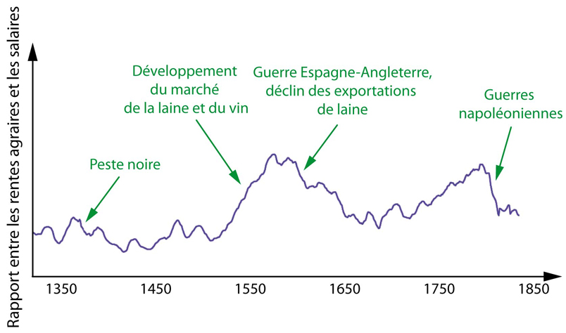 Les épidémies ont en général tendance à réduire les inégalités car elles diminuent la main d’œuvre, ce qui augmente les salaires. Les guerres peuvent augmenter les inégalités, suite à l’esclavage ou le pillage, ou les réduire par suite des destructions et de la famine que subissent les populations.