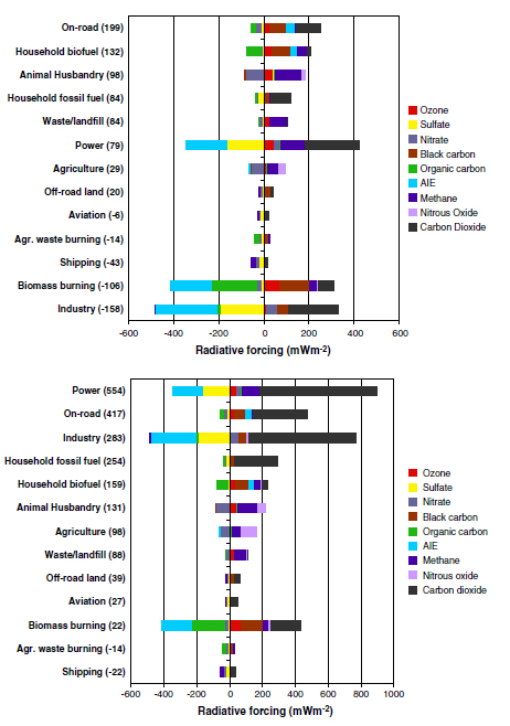 Unger et coll. Attribution of climate forcing to economic sectors, Proceedings of the National Academy of Science (USA) 107 (2010) 3382-3387 (doi: 10.1073/pnas.0906548107).