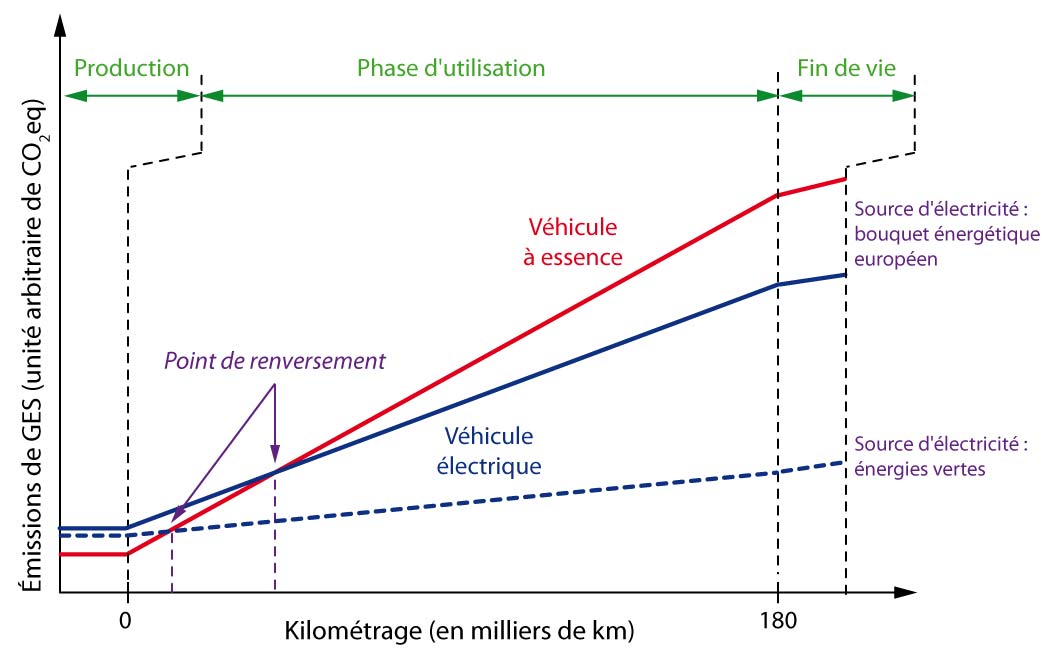 L’étude [1] montre que pour une société alimentée par des sources d’énergie typiques (le calcul est fait ici pour un modèle de bouquet énergétique équivalent à celui de l’Europe [4]), l’empreinte carbone des voitures électriques n’est amortie qu’après une utilisation de plusieurs dizaines de milliers de kilomètres [5]. L’ACV des voitures électriques est schématisé et comparé à celui des voitures conventionnelles sur la figure ci-dessous. On peut y voir qu’il existe un kilométrage à partir duquel l’empreinte carbone de la voiture électrique devient inférieure à celle des véhicules électriques (« point de renversement »).