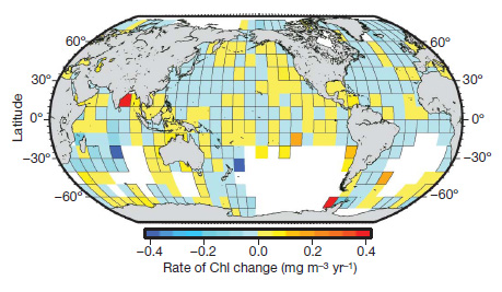 La figure ci-dessous montre la variation de la concentration de chlorophylle sur une carte de la planète dans des cellules de 10°×10°. Les cellules bleues connaissent une diminution et les cellules jaunes une augmentation. Globalement, les mesures montrent un déclin du phytoplancton dans 60% des cellules. Comme on peut le voir, les latitudes élevées sont plus sujettes à la baisse. Les cellules montrant un accroissement de phytoplancton se situent principalement dans l’est de l’Océan Pacifique et dans le nord et l’est de l’Océan Indien.