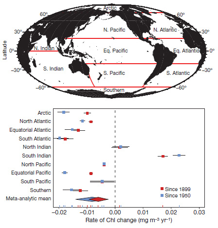 Le déclin le plus rapide a lieu dans l’Atlantique sud, au pôle sud et dans l’Atlantique équatorial. Des augmentations sont observées dans le nord et le sud de l’Océan Indien. En moyenne, sur l’ensemble des mers et océans, la baisse est annuellement de 0,006±0,00017 mg.m-3, soit une baisse annuelle de plus de 1% de la concentration moyenne de phytoplancton (estimée à 0,56 mg.m-3).