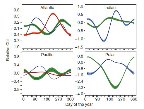 Les fortes variations saisonnières observées dans l’Océan Indien sont, elles, reliées à la dynamique des moussons et à l’apport d’eau douce et de nutriments. Les régions tempérées sont affectées par les variations saisonnières de l’ensoleillement et des vents et par leurs effets sur l’apport de nutriments aux eaux océaniques de surface.