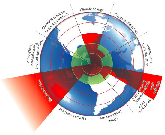 De ces neufs limites planétaires, trois ont déjà été dépassées, soient le réchauffement planétaire, l’érosion de la biodiversité et le cycle de l’azote. Dans ce dernier cas, la valeur actuelle est plus de trois fois supérieure à sa valeur critique. En ce qui concerne la biodiversité, il y au moins un, peut-être deux ordres de grandeur d’écart. Deux autres limites n’ont pu être déterminées par les auteurs de l’article (ozone stratosphérique, pollution chimique), de sorte qu’il est difficile d’estimer où se situe le niveau actuel. Les autres processus n’ont pas encore atteints leur limite.