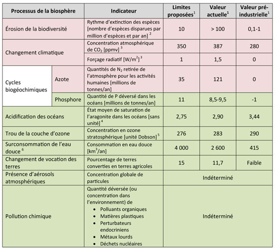Les neuf processus retenus sont l’érosion de la biodiversité, les changements climatiques, l’acidification des océans, le trou de la couche d’ozone de la stratosphère, les cycles biogéochimiques (azote et phosphore), l’utilisation de l’eau douce, le changement de vocation des terres, la pollution chimique et la teneur de l’atmosphère en aérosols.1 L’indicateur de chaque processus menacé, sa valeur avant l’ère industrielle, la valeur actuelle et la limite à ne pas dépasser sont décrits dans le tableau ci-dessous. Des détails sur certains indicateurs peuvent être trouvés dans les références du tableau et la bibliographie qu’elles contiennent.