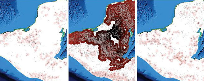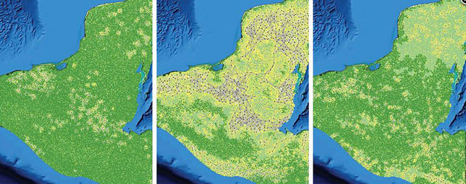 Le modèle, tel que l’ont développé Scott Heckbert et son équipe du Alberta Innovates Technology Futures [2], est composé d’une population dont la démographie varie avec le temps, et de cellules qui découpent la région considérée – forêts, terres agricoles ou cités – et représentent les différents lieux où les individus s’établissent. Ces cellules sont connectées entre elles par des liens commerciaux et finissent par constituer un réseau d’échange. Au cours de leur évolution, chacune des cellules est caractérisée par ses conditions climatiques, le pourcentage de couvert forestier et la qualité de ses sols. Ce modèle a été appliqué à la civilisation Maya, d’où son nom, « MayaSim » [2].