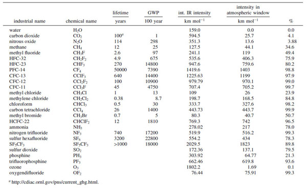 Le tableau ci-dessous donne le temps de vie, le « Global Warming Potential » (GWP), l’intensité IR totale, l’intensité entre 800 et 1400 cm-1 (efficacité radiative), ainsi que le pourcentage de l’intensité IR qui se situe dans la fenêtre atmosphérique de certains GES. À titre d’exemple, des composés fluorés comme le fréon 12 ou le SF5CF3 ont respectivement des efficacités radiatives de 970,1 et 1823 km/mol.