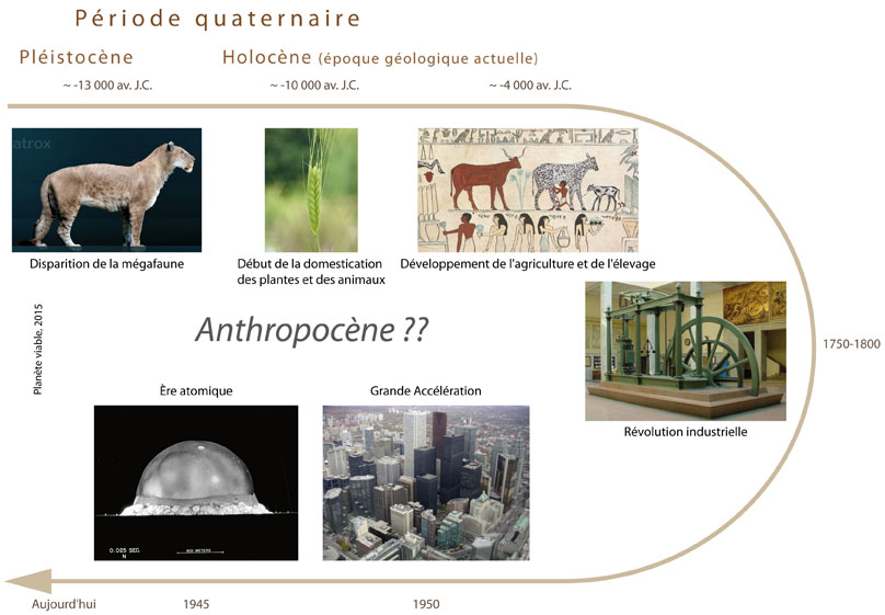 Récemment, l’avènement des essais d’explosion de bombes atomiques (premier essai au Mexique le 16 juillet 1945, voir photo) a été proposé comme origine de l’Anthropocène car les radionucléides laissent une trace caractéristique et facilement identifiable dans les couches stratigraphiques [4,5]. À l’opposé si l’on peut dire, certains experts pensent plutôt que l’Anthropocène a commencé dès le début du développement d’Homo sapiens sur la planète, alors qu’il amorçait la domestication des plantes et des animaux, de sorte que le terme Holocène, notre époque géologique actuelle, pourrait purement et simplement être remplacé par Anthropocène [6].
