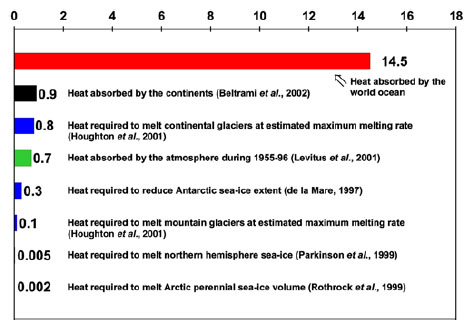 Pour bien comprendre l’équilibre énergétique de la Terre et l’ampleur du réchauffement climatique, il faut connaître la quantité d’énergie qui est absorbée par les différents éléments qui la composent, soient les océans, les continents, l’atmosphère, les glaciers, etc. Dans un article de Geophysical Research Letters, des chercheurs du Maryland ont évalué la quantité de chaleur absorbée par les océans durant la période courant 1955 à 2003 (les mesures ont d’ailleurs été réévaluées en 2008, voir la bibliographie ci-dessous).