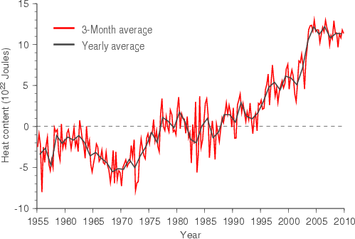 Au vue des courbes ci-dessous, la tendance est clairement à la hausse, soit une augmentation moyenne de la chaleur absorbée de 0,4.1022 ± 0,05 Joules/an (ou J/an) entre 1969 et 2008. C’est l’équivalent de 0,25 W/m2 par unité de surface totale de la Terre. Entre 1955 et 2008, l’augmentation moyenne est de 0,27.1022 ± 0,04 J/an (soit 0,17 W/m2 par unité de surface de la Terre). En tout, c’est ~14,5.1022 J qui ont été absorbés par les océans entre 1955 et 1998.