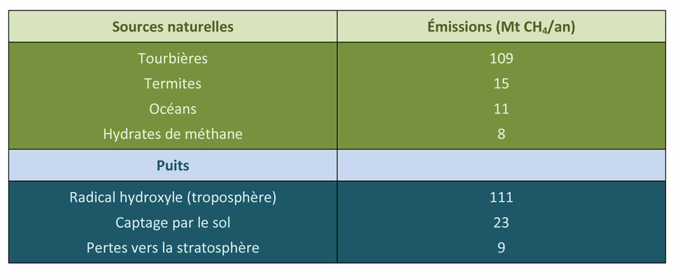 Tableau 1. Émissions et déplétions du méthane avant l’ère industrielle. Source : [4] (d’autres sources plus récentes ont revu ces valeurs à la hausse, voir référence [11]).