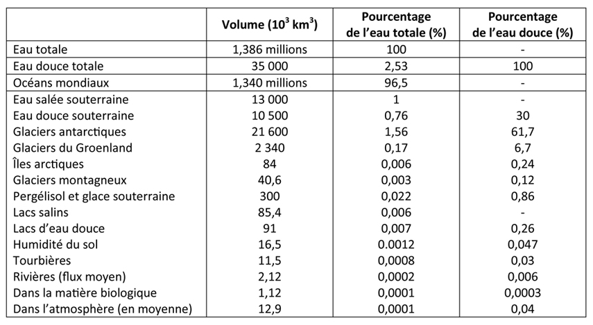 Le volume total d’eau que porte la Terre est de 1,4 milliards de km3 ou 1,4 billions de m3 (1,4.1012 m3). De ce volume, 2,53 %, soit 35 millions de km3 (ou 35 Gm3), est de l’eau douce (tableau ci-dessous). La majeure partie de l’eau de la planète est salée et est contenue dans les différentes mers et océans. Une petite partie d’eau salée se retrouve aussi dans des aquifères souterrains (1 %) et dans des lacs (0,006 %).