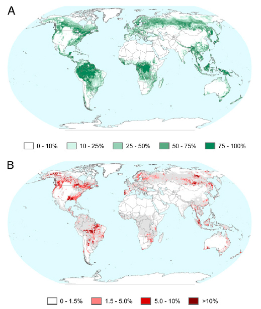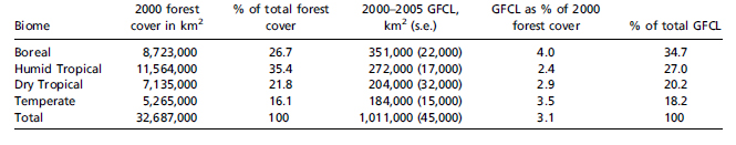 Les données sur la superficie du couvert forestier et son évolution sont importantes pour évaluer les efforts des nations visant à réduire leurs émissions de CO2. Elles le sont également pour comprendre l’impact sur les processus biogéochimiques et hydrologiques à une échelle planétaire, ainsi que sur la biodiversité et sur le climat. L’étude publiée dans Proceedings of the National Academy of Science (M. Hansena, S. Stehmanb et P. Potapova, Quantification of global gross forest cover loss 107 (2010) 8650-8655) estime la perte brute de couvert forestier (PBCF) pour différents biomes (régions boréales, tempérées, tropiques sèches et tropiques humides), à l’échelle des continents et pour les pays possédant plus de un million de km2 de forêt. L’année de référence est 2000.
