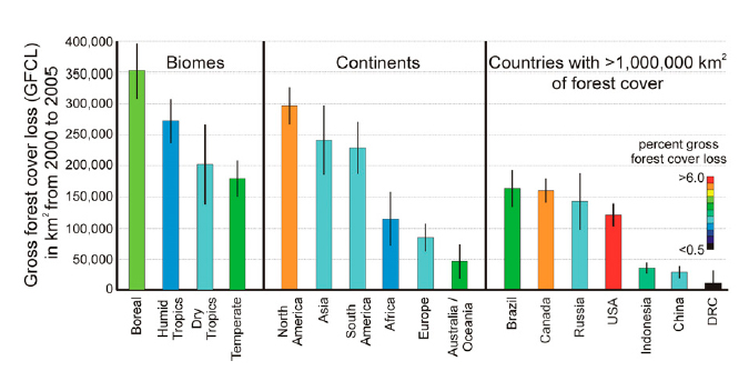 À l’aide d’une technique d’imagerie par satellite, des chercheurs ont mesuré la perte brute de couvert forestier (PBCF) entre 2000 et 2005. L’étude montre qu’en 2000, le couvert forestier était de 32 688 000 km2 et que 1 011 000 km2 ont été perdus durant cette période, soit 3,1% du couvert forestier existant en 2000 (0,6% de perte par année en moyenne). L’Amérique du Nord est le continent le plus touché et le Canada est le deuxième pays ayant la plus grande surface forestière qui a disparu.