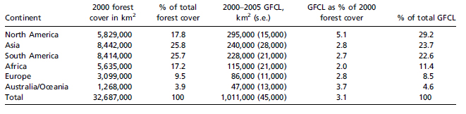 L’Asie et l’Amérique du Sud sont les continents qui abritent le plus de forêts (respectivement 8 442 000 et 8 414 000 km2), mais c’est en Amérique du Nord que le plus de PBCF est enregistré. C’est globalement près de 30% des pertes de forêts qu’on y mesure, soit 5,1% du couvert forestier de l’année 2000. Les causes principales sont l’exploitation forestière et les incendies.