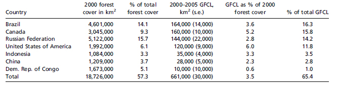 La Russie se situe au troisième rang avec des pertes causées principalement par l’exploitation forestière dans la partie européenne et la partie est du territoire, et aux feux de forêts en Sibérie. La République du Congo a la plus petite PBCF avec 10 000 km2, soit 0,6% par rapport à la superficie totale mesurée en 2000. Très proche se situe la Chine, quoiqu’en pourcentage elle se rapproche de la Russie.